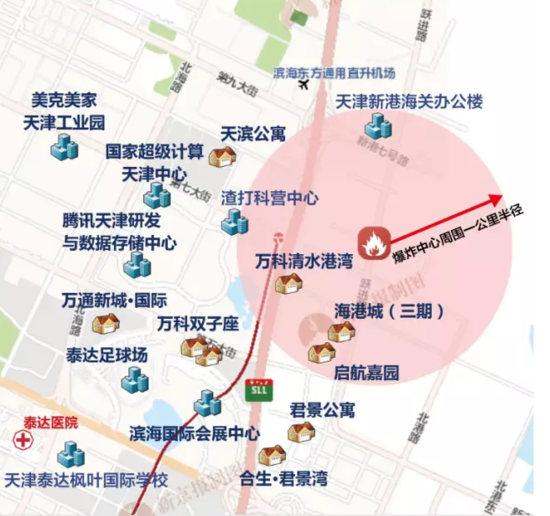 爆炸點(diǎn)方圓3公里分布住宅小區(qū)數(shù)量多達(dá)十五個(gè)以上,萬科海港城離爆炸點(diǎn)僅600米。這些居民區(qū)建筑多為高層板樓,居住密度極大,爆炸點(diǎn)周圍1000米內(nèi),有超過5600戶住戶。
